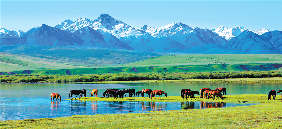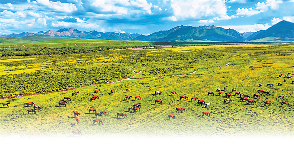 白雪皚皚的祁連山下,一眼望不到邊的大片牧草青翠碧綠,色彩斑斕的野花競(jìng)相開(kāi)放,擁有百萬(wàn)畝草原的山丹馬場(chǎng)如巨幅彩色畫(huà)卷徐徐展開(kāi)。