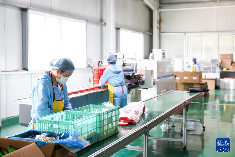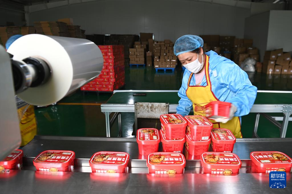 7月22日,在天水市秦州區(qū)一家農(nóng)業(yè)企業(yè),工人在麻辣燙方便食品生產(chǎn)線上作業(yè)。新華社記者 范培珅 攝