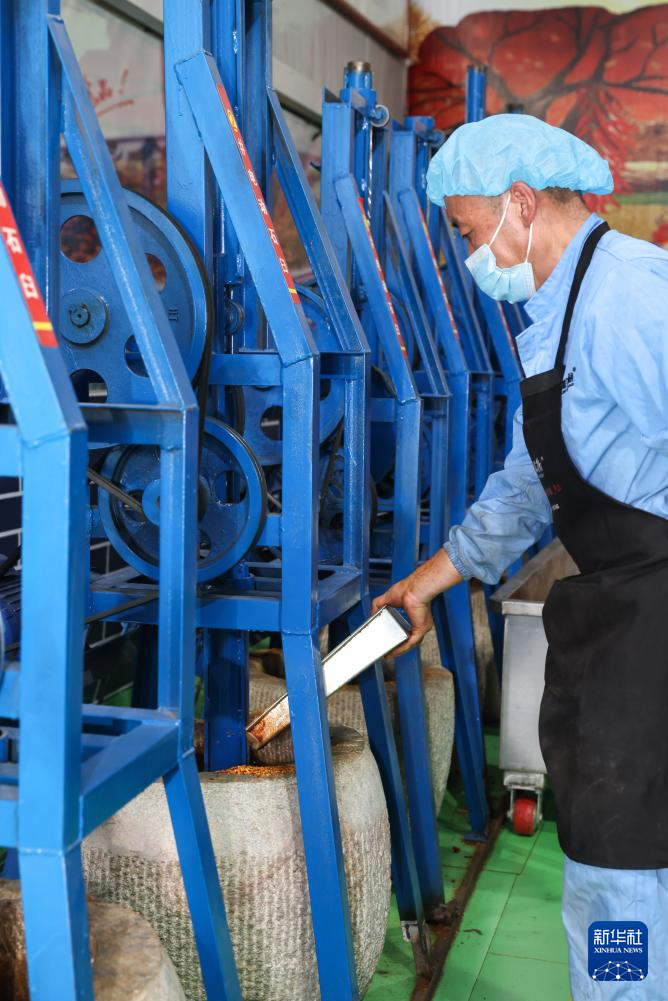 7月22日,工作人員在甘肅天水市甘谷縣安遠(yuǎn)鎮(zhèn)的辣椒烘干和加工車間里操作電動(dòng)石臼。新華社記者 呂帥 攝