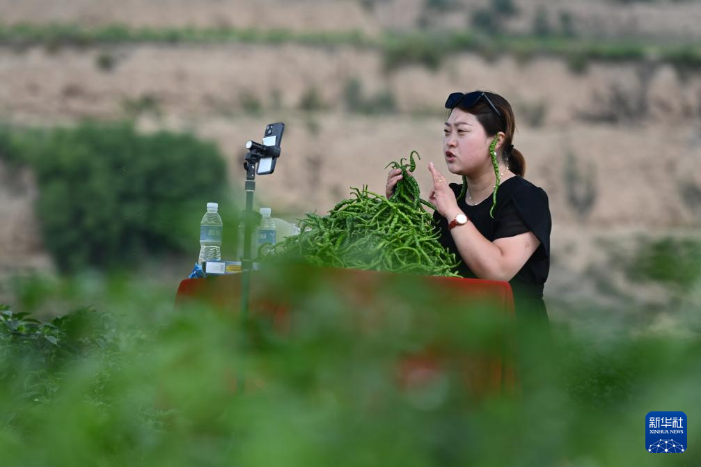 7月22日,在天水市甘谷縣新興鎮(zhèn)侯家溝村的辣椒生產(chǎn)基地,工作人員直播銷售辣椒。新華社記者 范培珅 攝