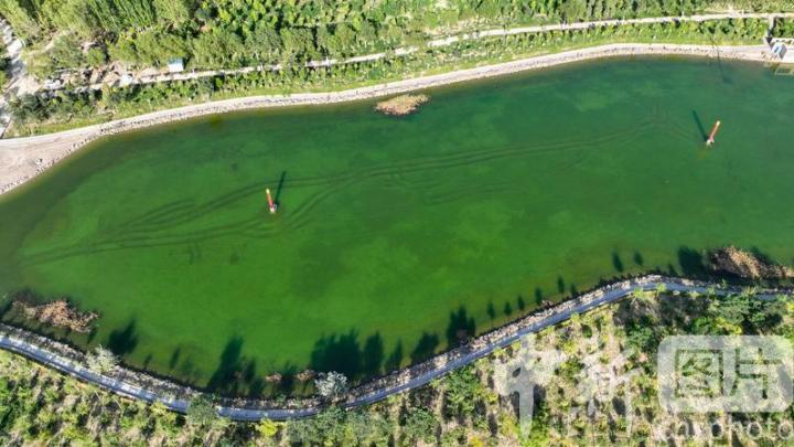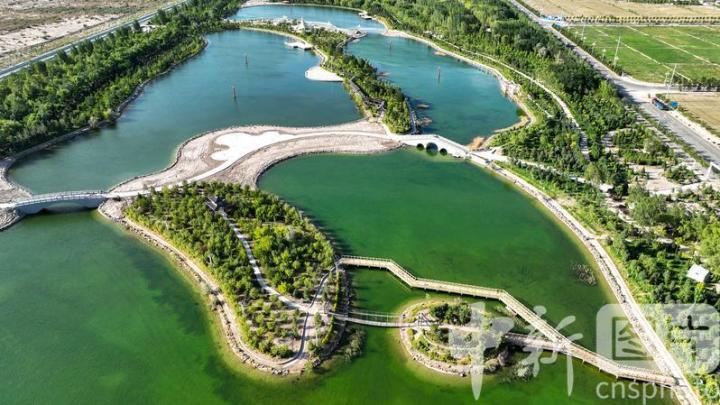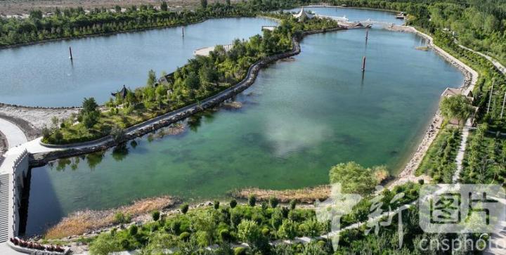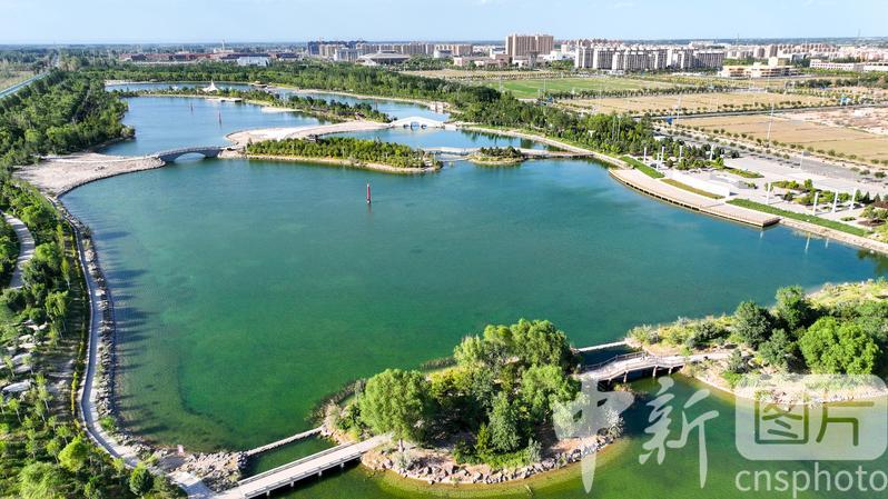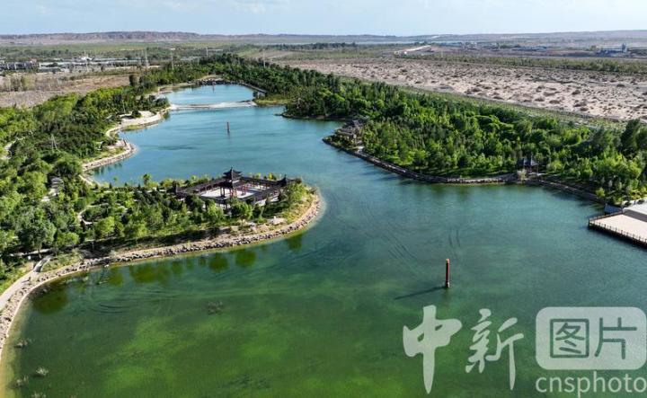 2024年7月27日,航拍甘肅省酒泉市金塔縣城西生態(tài)湖,綠意盎然,生機勃勃,構(gòu)成了“戈壁水鄉(xiāng)”的獨特畫卷。中新社發(fā) 曹紅祖 攝