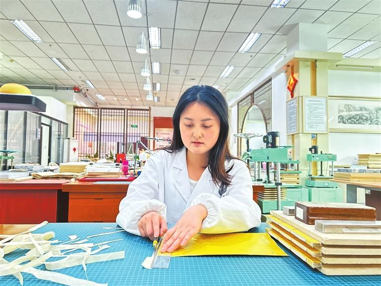 今年23歲的羅雪瑞是保護中心里的古籍修復師。她告訴記者:“在學校時學的是工藝美術(shù)品設計專業(yè)書畫裝裱方向,需要很強的動手能力,這為古籍修復工作打下了很好的基礎。”