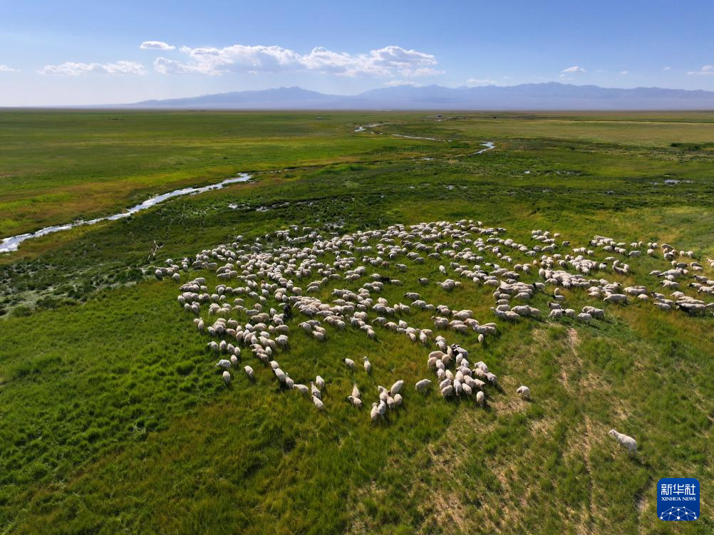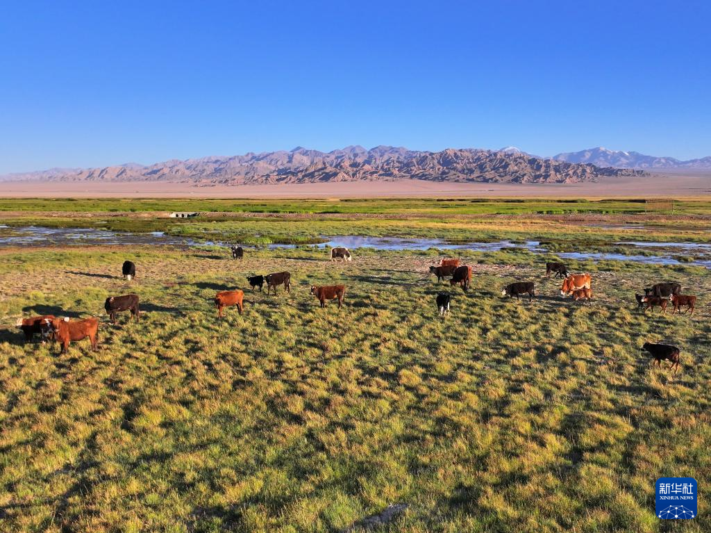 盛夏時節(jié),地處甘肅省酒泉市阿克塞哈薩克族自治縣阿伊納鄉(xiāng)境內的大、小蘇干湖濕地,綠草如茵,牛羊成群,呈現(xiàn)出一幅生機勃勃的草原生態(tài)畫卷。