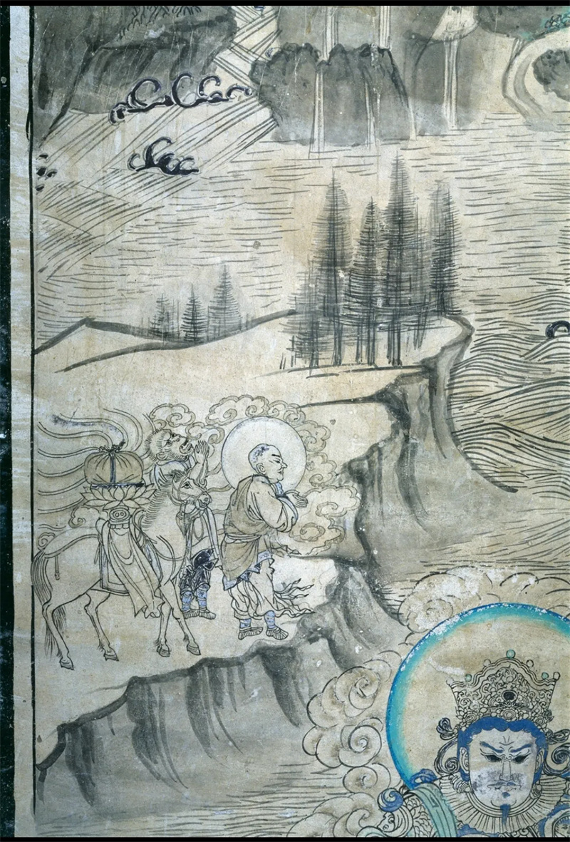 敦煌壁畫中現(xiàn)存六幅唐僧取經(jīng)圖,其中時(shí)代最早、保存最完好的一幅繪于西夏時(shí)期榆林窟第3窟的《普賢變》中。此幅唐僧取經(jīng)圖似是唐僧師徒在取經(jīng)途中遭遇難關(guān),誠(chéng)心祈求菩薩協(xié)助渡難。圖中,唐僧身披袈裟,雙手合十,彎腰向前,遙望普賢菩薩參拜。唐僧身后,長(zhǎng)相似猴的人雙手合十,抬頭仰望,向普賢致禮,他就是孫悟空的原型——石磐陀。師徒身后有一匹白馬,靜立等待。他們站在懸崖深壑前,面前呈現(xiàn)山窮水盡已無(wú)路的困境。