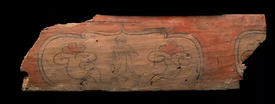 彩繪“猴”生肖木版畫,唐代,一級(jí)文物。1979年肅南縣大長(zhǎng)嶺唐墓出土。木版畫長(zhǎng)73厘米,寬22厘米,猴生肖木版畫呈長(zhǎng)方形,墨筆雙線勾勒一壸門開光。壸門內(nèi)墨線勾勒一猴,其雙手環(huán)抱膝蓋至胸前,猴身兩側(cè)繪有兩朵升騰祥云。壸門外飾以土紅色。