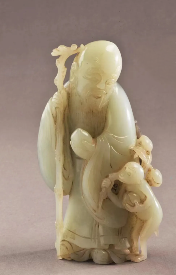 玉壽星,清代,高15.5厘米,寬9厘米,厚4.7厘米。用整塊和田青白籽料琢制,正面玉質(zhì)潔白溫潤(rùn),背部有黑灰泌色。壽星頭微左傾,桃額,慈目善眉,大耳長(zhǎng)頸,著廣袖大袍,左手持壽桃,右手持龍首杖,袍下微露云頭履。左側(cè)有一躬身站立猴子,左臂抱一壽桃,右肩扛桃枝。玉雕為俏色雕刻而成,融圓雕、線刻、透雕等手法,將壽星的慈祥和小猴子的可愛表現(xiàn)于一體。