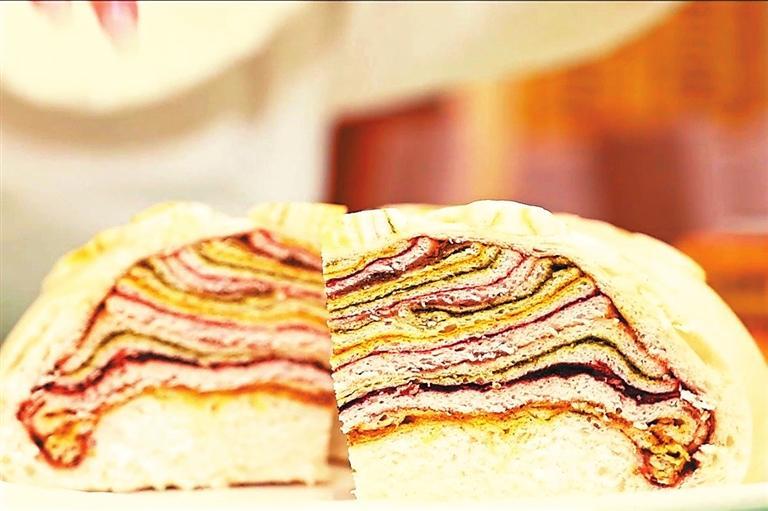 母親最拿手的還是做千層大月餅,做法與平常做饃有點(diǎn)不一樣,發(fā)好面后取適量揉好,切成同樣大小的若干份并搟壓成長方形的薄面皮。一層薄皮一層餡,餡料與烙的糖饃有的不一樣,重在色澤,每層分別抹上姜黃、紅曲、苦豆(香豆)粉、芝麻、菜籽油、糖玫瑰、葡萄干,黃、紅、黑、綠相間,一層黃一層綠一層紅一層黑,一層白糖一層紅糖一層玫瑰糖,一層一層摞好,做成一個六七層的圓餅。最后用薄皮蓋住一摞摞面皮,餅邊捏緊捏好后壓花塑形,表面用模型壓花,用專用做飯梳子一行行點(diǎn)上,或一行白鷺上青天,面皮如一塊畫布,精雕細(xì)琢,怎么好看怎么做,做得隨心所欲又精心設(shè)計(jì)。還會刷姜黃與菜籽油拌好的油料,撒上芝麻粒和葡萄干,一個千層餅就基本成型了。