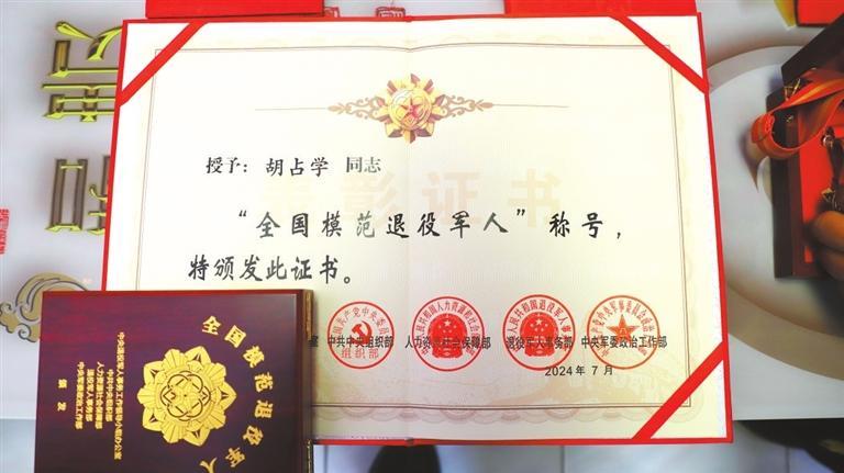 今年8月,胡占學(xué)被人力資源和社會(huì)保障部、中共中央組織部、退役軍人事務(wù)部、中央軍委政治工作部等軍地相關(guān)部門聯(lián)合授予“全國(guó)模范退役軍人”榮譽(yù)稱號(hào),這是對(duì)退役軍人的最高榮譽(yù)和最大褒獎(jiǎng)。