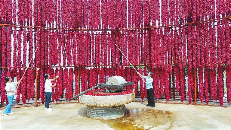 位于甘谷縣安遠(yuǎn)鎮(zhèn)上河灣村的甘肅隴上椒農(nóng)業(yè)科技(集團(tuán))有限公司,工作人員正在晾曬辣椒。新甘肅·甘肅日?qǐng)?bào)通訊員 王啟寧