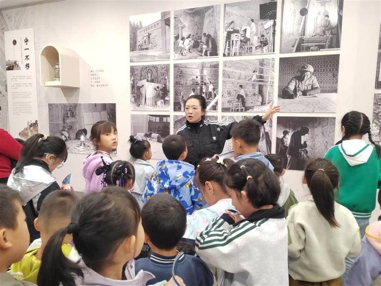 為了使小朋友們能夠身臨其境感受敦煌文化的魅力,主持人還為每一位小朋友發(fā)放了一本“敦煌小畫師”的研學(xué)手冊,并帶領(lǐng)大家前往蘭州市圖書館“近鄰”——敦煌藝術(shù)館進(jìn)行了一場藝術(shù)研學(xué)之旅。在敦煌藝術(shù)館內(nèi),孩子們見證了第220號石窟的壯觀,欣賞了館內(nèi)200余件文化展品,追溯了莫高窟的歷史淵源,了解了壁畫繪制和建筑元素的藝術(shù)審美,學(xué)習(xí)了“壁上丹青”的顏料密碼。