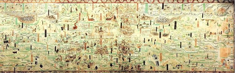 莫高窟61窟,建于五代晚期,是河西歸義軍節(jié)度使曹元忠及夫人開鑿的功德窟,又稱“文殊堂”,主要為供奉文殊菩薩而修。該窟的亮點是西壁的巨幅五臺山圖。這是敦煌壁畫中規(guī)模最大的山水人物圖,也是全景式歷史地圖。五臺山圖長13.6米,高3.5米,畫中詳細描繪了東起河北正定,西至山西太原,方圓五百里的山川地形及社會風情,再現(xiàn)了五代時期五臺山佛國圣境的氛圍。