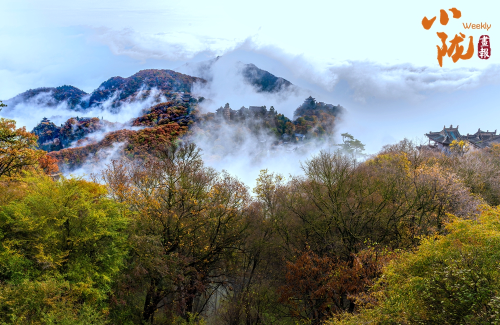 一葉知冬,遍地金黃。五彩斑斕的林木與古香古色的建筑、遠(yuǎn)處的山巒云霧相映成趣,盡顯詩(shī)意之美。