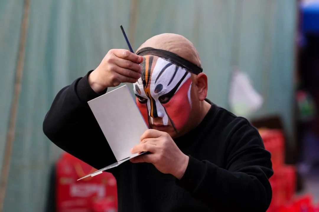換好戲服,化好戲妝,戴上頭冠,鑼鼓響起,大幕拉開(kāi),演員一開(kāi)口,吼出一嗓高亮秦腔,嘯出黃天厚土的氣魄,臺(tái)下響起震雷般的掌聲。一時(shí)間,臺(tái)上臺(tái)下,你唱我和,慷慨激昂的唱詞從每個(gè)人的胸腔吼出,有熱淚在流,有情緒在涌動(dòng),這是西北人的年,是西北人的歲月狂歡。