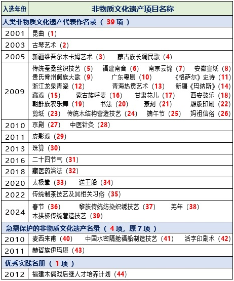 表一:中國(guó)44項(xiàng)非物質(zhì)文化遺產(chǎn)名錄、名冊(cè)