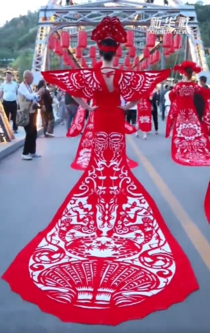 慶陽(yáng)剪紙?jiān)从谏?、講究情趣,是勞動(dòng)人民生產(chǎn)生活、情感氣質(zhì)、觀念習(xí)俗和文化傳承的結(jié)晶。著名民俗學(xué)家靳之林先生稱(chēng)剪紙藝人是“真正的藝術(shù)家”。1986年,中央美術(shù)學(xué)院邀請(qǐng)鎮(zhèn)原縣民間美術(shù)大師祁秀梅赴北京進(jìn)行民間美術(shù)教學(xué)交流,向大學(xué)生演示民間剪紙。法國(guó)、日本、澳大利亞等國(guó)家的藝術(shù)家也多次專(zhuān)程到隴東考察民間剪紙藝術(shù)。慶陽(yáng)剪紙已由鄉(xiāng)村婦女手中的小玩意,堂而皇之地步入了國(guó)家藝術(shù)殿堂——中國(guó)民間美術(shù)館,并在日、意、澳等國(guó)家展覽亮相。圖為身著慶陽(yáng)剪紙服裝的模特們行走在蘭州中山橋上,驚艷了來(lái)往的游客。