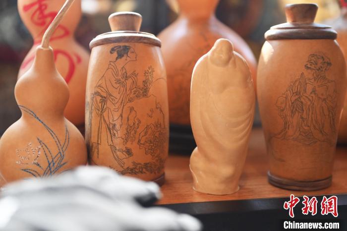 2月8日,甘肅省蘭州市城關(guān)區(qū)“非遺年貨購物月”活動(dòng)現(xiàn)場展出的刻葫蘆文創(chuàng)產(chǎn)品。 中新社記者 李亞龍 攝