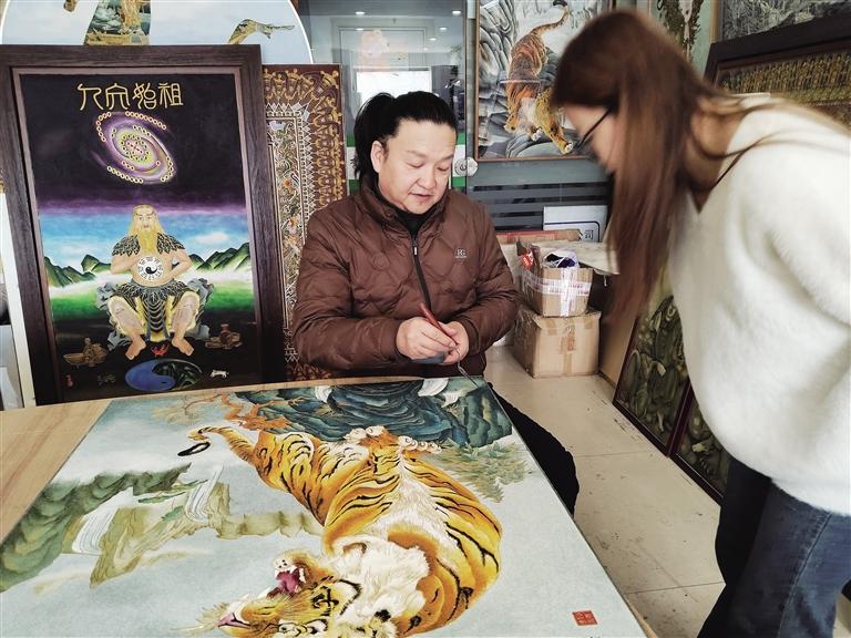 不遠(yuǎn)處的刻葫蘆攤位前,非遺代表性傳承人阮熙越運(yùn)刀如筆,在打磨光潤的葫蘆表面刻出圖案。“刻針深淺決定墨色濃淡,蘭州葫蘆皮質(zhì)厚實(shí),才能承載這樣的藝術(shù)語言。”正在體驗(yàn)刻繪的大學(xué)生張萌說。從傳統(tǒng)書畫到現(xiàn)代動(dòng)漫IP,從擺件到車掛,近幾年刻葫蘆在創(chuàng)新中走向大眾。據(jù)文旅部門統(tǒng)計(jì),非遺購物月期間刻葫蘆銷售火熱,成為最受游客青睞的“蘭州名片”。