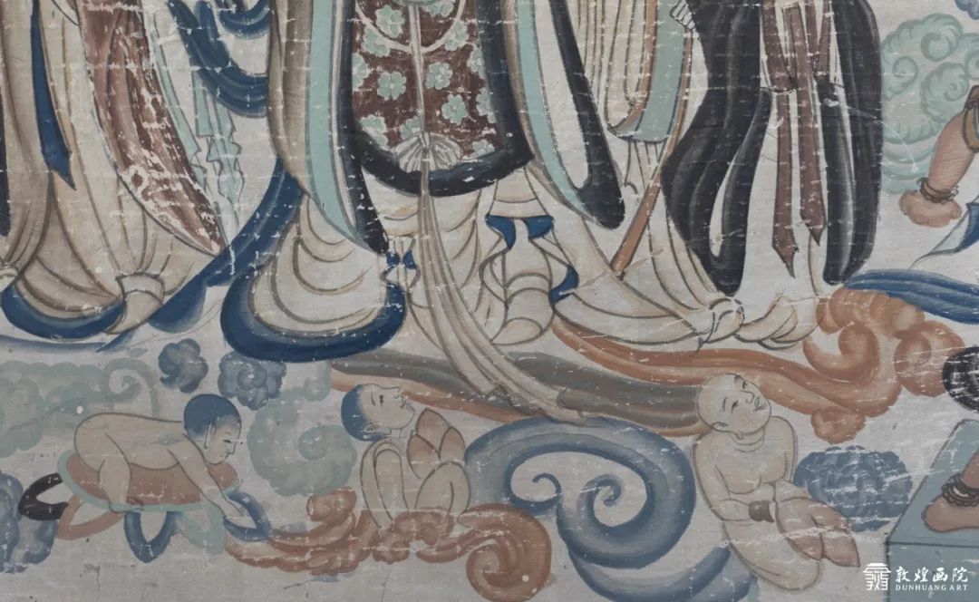 這幅臨摹于榆林窟25窟的化生童子雙手合十,外面蓮花瓣層層盛開,透過透明的花苞可以看到童子即將降生,生動可愛,和電影中的情節(jié)遙相呼應(yīng)。