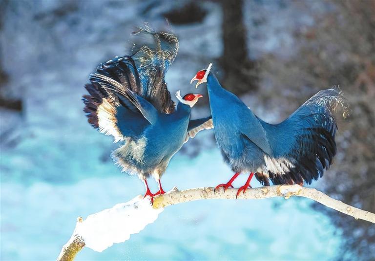 藍馬雞是珍稀名貴的禽類,頭側(cè)緋紅,耳羽簇白色、突出于頸部頂上,通體藍灰色,中央尾羽特長而翹起,尾羽披散下垂如馬尾,故名藍馬雞。冬日里,藍馬雞成群飛落山腳覓食,藍羽丹頂行走在雪地上格外搶眼。數(shù)量繁多的藍馬雞是祁連山野生山地雞的“顏值擔(dān)當”。覓食時,藍馬雞常用爪刨挖林中空地苔蘚和林緣草地,尋找掉落的云杉種子。刨食的過程會讓土壤松動,便于種子生根發(fā)芽,促進林區(qū)植物天然更新。