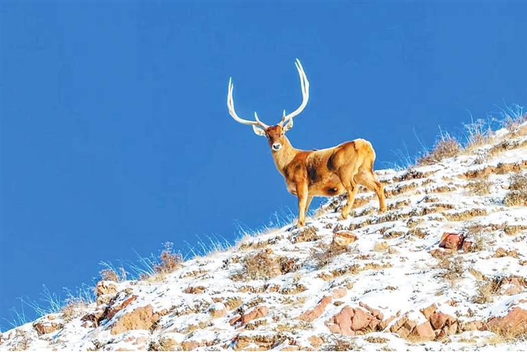 白唇鹿,是國家一級保護野生動物,中國特有鹿種,主要分布在青藏高原及其邊緣地帶的高山草原地區(qū),為典型的高寒物種,在當?shù)乩习傩昭壑斜灰暈?ldquo;神鹿”。白唇鹿嘴唇的周圍和下頜為白色,故得名。