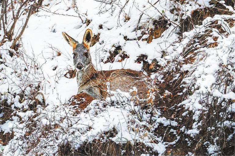 攝影師鏡頭下,一只馬麝安然臥在雪地上,它的耳朵偶爾會輕輕抖動一下,像是在用心傾聽著風(fēng)中傳來的細微聲響。它優(yōu)美的身形與周圍的景色完美融合在一起,寧靜而祥和。