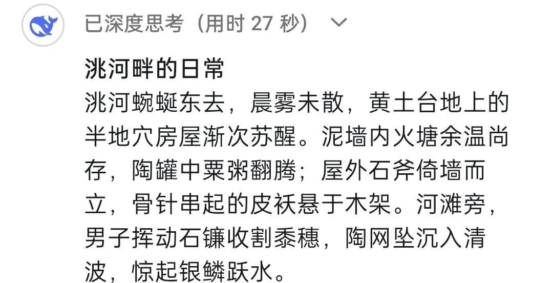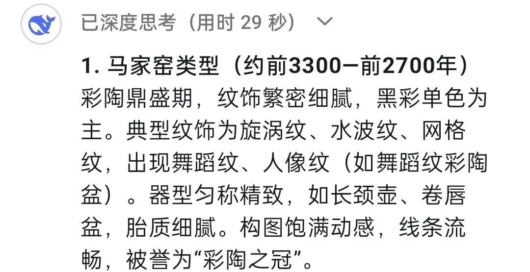 DeepSeek:馬家窯文化作為人類(lèi)文明長(zhǎng)河中一顆璀璨的明珠,因最早發(fā)現(xiàn)于甘肅省臨洮縣馬家窯村而得名,它被認(rèn)為是仰韶文化向西發(fā)展的延續(xù),它展現(xiàn)了黃河上游先民的創(chuàng)造力,更是史前人類(lèi)與自然對(duì)話、與社會(huì)共生的見(jiàn)證。