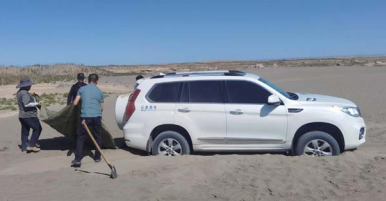 車(chē)子終于在陷入沙地3小時(shí)后脫離困境??疾靾F(tuán)在羊井子鄉(xiāng)用過(guò)午餐后返回酒泉。