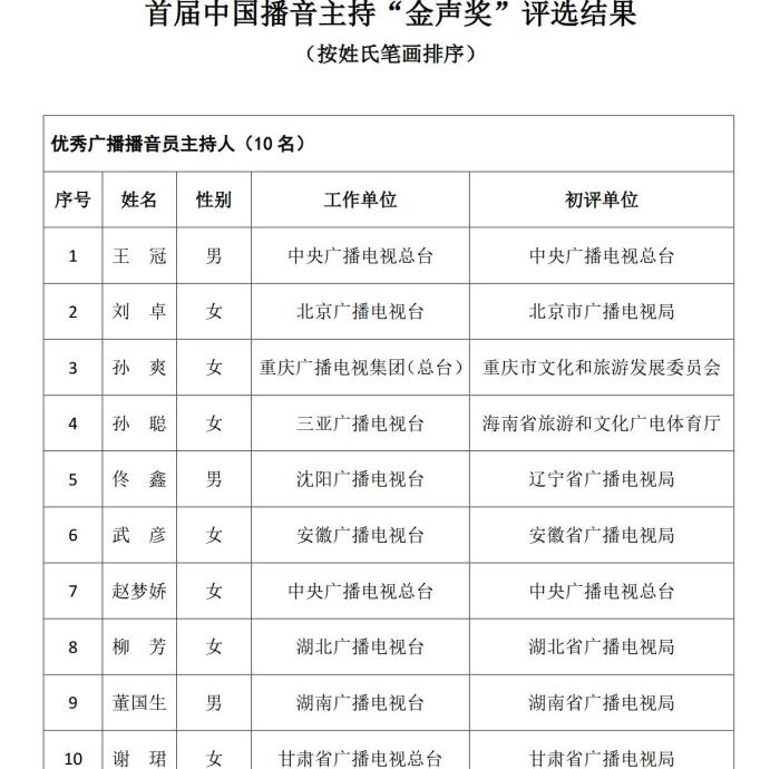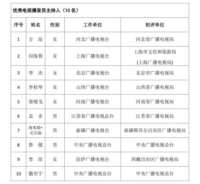 《通知》指出,根據(jù)《國家廣播電視總局辦公廳關(guān)于組織參加中國廣播電視節(jié)目獎•首屆中國播音主持“金聲獎”評選工作的通知》(廣電辦發(fā)〔2021〕277號),經(jīng)過初評、復評和終評,評選出優(yōu)秀廣播播音員主持人、優(yōu)秀電視播音員主持人各10名?,F(xiàn)將評選結(jié)果予以公示,公示期為5個工作日。