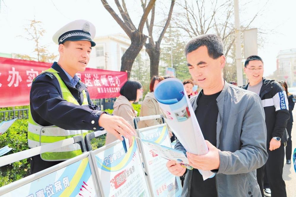 民警給過路群眾發(fā)放宣傳資料。4月8日,鎮(zhèn)原縣公安局交警大隊(duì)開展“春風(fēng)送法暖民心”主題宣傳活動(dòng)。新甘肅·甘肅法治報(bào)記者馬志國(guó)攝