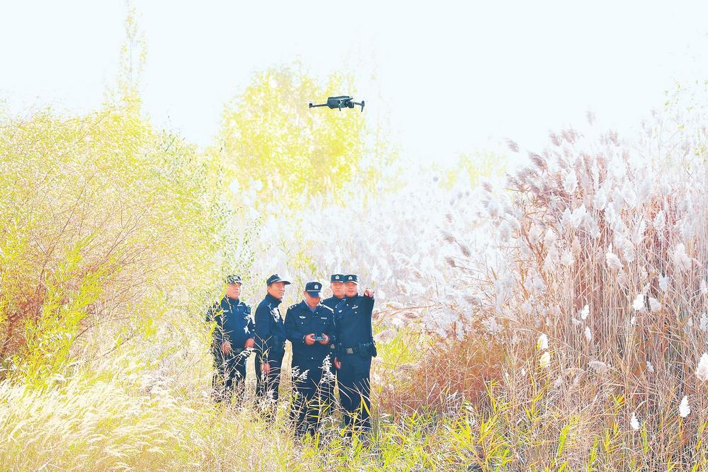 民警在濕地公園利用無人機開展巡查。