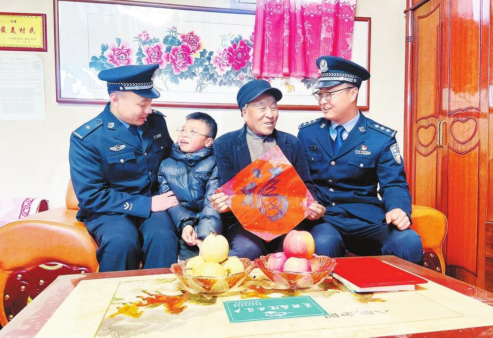 “史大爺,過年好呀!我們送福來了。”民警小李一邊說著,一邊將一張福字遞到史大爺手中。史大爺接過福字,笑得合不攏嘴,激動地說:“謝謝你們啊,警察同志,這福字往門上一貼,年味兒一下子就濃了!平日里多虧了派出所民警的照顧,這大過年的還想著我們,你們辛苦了。”