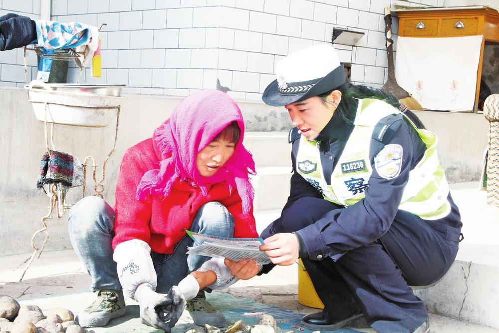 民警向群眾宣傳交通安全知識。3月10日,臨洮縣公安局交警大隊民警走村入戶,開展交通安全宣傳活動。新甘肅·甘肅法治報通訊員楊小娟攝