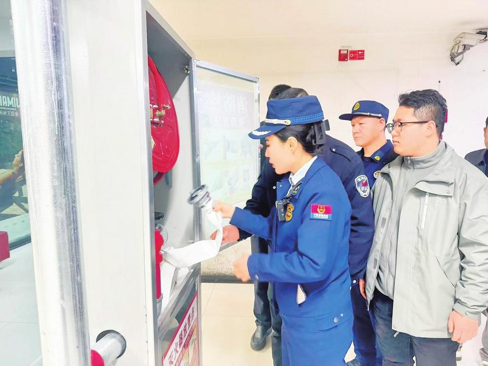 張文娟和同事檢查消防安全設(shè)施。城關(guān)區(qū)消防救援大隊(duì)供圖