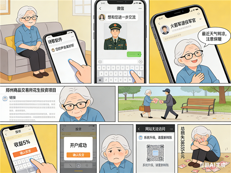 警方拆解該案騙術(shù)發(fā)現(xiàn),騙子共分七步將紀(jì)奶奶從“詩友”變成“提款機(jī)”。第一步,潛入詩歌朗誦這類中老年人聚集的興趣社群,精準(zhǔn)篩選目標(biāo);第二步,以“聲音好聽”為切入點(diǎn),通過情感鋪墊營造“黃昏戀”錯(cuò)覺,建立情感依賴;第三步,多次切換聊天軟件,躲避平臺(tái)反詐監(jiān)測;第四步,偽裝“火箭軍”身份,利用老一輩對軍人的天然信任感,以國家信譽(yù)背書;第五步,讓老人幫忙操作虛假賬戶,親眼見證“穩(wěn)賺5%”的假象;第六步,邀請老人自己投資,誘導(dǎo)其向個(gè)人銀行卡轉(zhuǎn)賬;第七步,要求線下現(xiàn)金交易,繞過銀行風(fēng)控,增加資金追回難度。