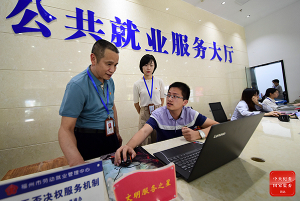 連日來,福建省福州市紀(jì)委監(jiān)委駐市委組織部紀(jì)檢監(jiān)察組深入市人社局下屬單位、有關(guān)企業(yè)調(diào)研督查“穩(wěn)崗就業(yè)”工作推進落實情況。圖為紀(jì)檢監(jiān)察組成員在福州市公共就業(yè)服務(wù)大廳,對相關(guān)工作進行調(diào)研監(jiān)督。李德鄰 攝