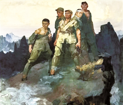 油畫《狼牙山五壯士》是畫家詹建俊為慶祝新中國成立十周年而作,描繪的是抗日戰(zhàn)爭時期五位八路軍戰(zhàn)士在寡不敵眾的情況下頑強戰(zhàn)斗,直到打光最后一顆子彈毅然砸槍跳崖的英勇場面。