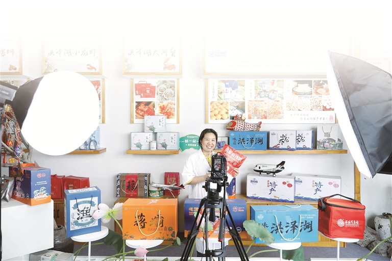 5月21日,江蘇省淮安市洪澤區(qū)“漁姑娘”助農(nóng)直播間內(nèi),主播正在向網(wǎng)友介紹當(dāng)?shù)靥厣r(nóng)產(chǎn)品。陳凱 攝