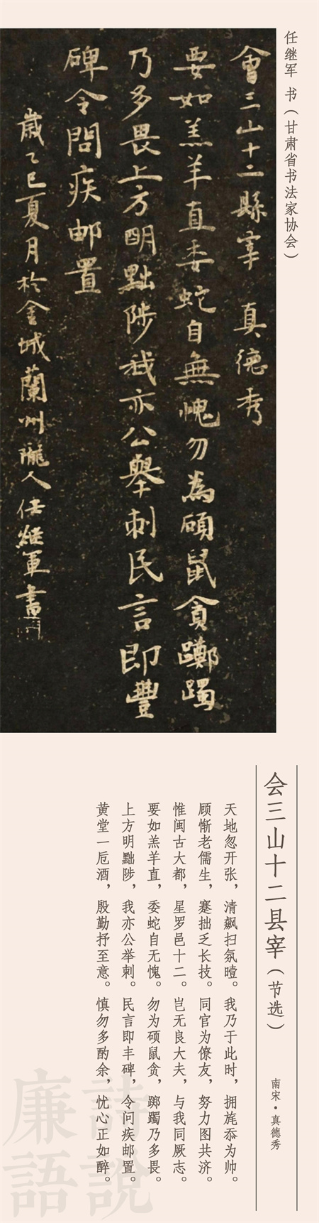 公元1232年,南宋官員真德秀到福州擔(dān)任知府,到任后把下轄12個(gè)縣的知縣召集在一起集體談話,擺事實(shí)、講道理,談廉政、申紀(jì)律,事后將談話內(nèi)容寫成了詩(shī),就是今天我們看到的這首作品。這是一首五言敘事詩(shī),長(zhǎng)達(dá)250字,這里我們節(jié)選后半部分。