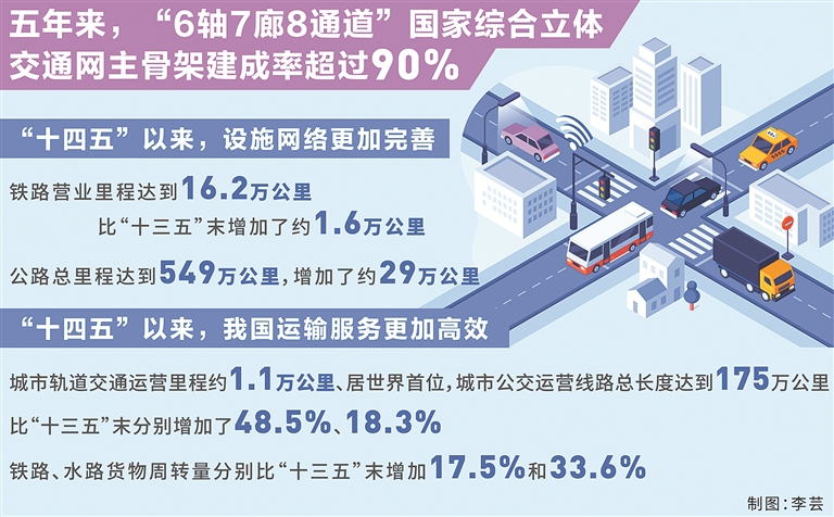 “人員貨物的高效流動彰顯了中國繁榮發(fā)展的活力。在過去一年中,平均每天約有1.8億人次跨區(qū)域出行、每天運(yùn)送1.6億噸貨物、每天攬收4.78億件快遞。”劉偉說,“十四五”以來,我國運(yùn)輸服務(wù)更加高效,軌道交通、常規(guī)公交、慢行交通網(wǎng)絡(luò)融合發(fā)展,城市軌道交通運(yùn)營里程約1.1萬公里、居世界首位,城市公交運(yùn)營線路總長度達(dá)到175萬公里,比“十三五”末分別增加了48.5%、18.3%。鐵路、水路貨物周轉(zhuǎn)量分別比“十三五”末增加17.5%和33.6%,港口集裝箱鐵水聯(lián)運(yùn)量年均增速約15%。去年,全社會物流成本節(jié)約超過4000億元,其中交通運(yùn)輸成本降低了約2800億元。