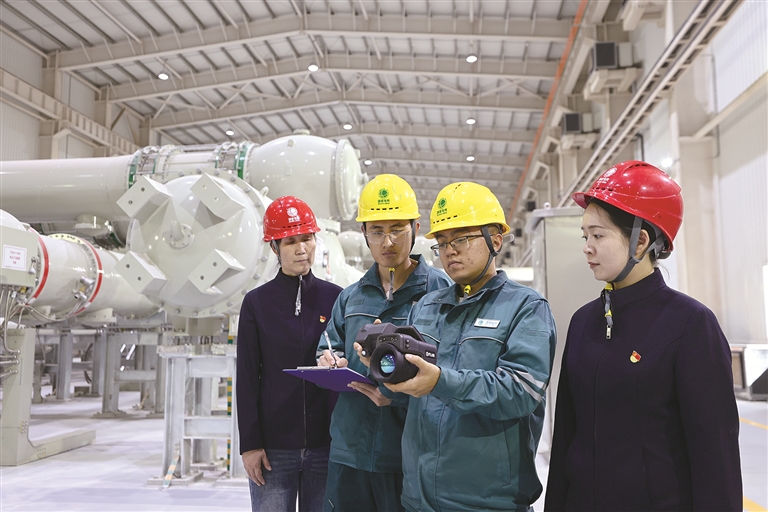 國網(wǎng)寧夏電力有限公司紀(jì)委以有力監(jiān)督推動“寧電入湘”特高壓線路工程投運后各項工作平穩(wěn)有序推進(jìn)。圖為近日,該公司紀(jì)委工作人員在國網(wǎng)寧夏超高壓公司中寧換流站開展現(xiàn)場監(jiān)督檢查。王天鵬 攝