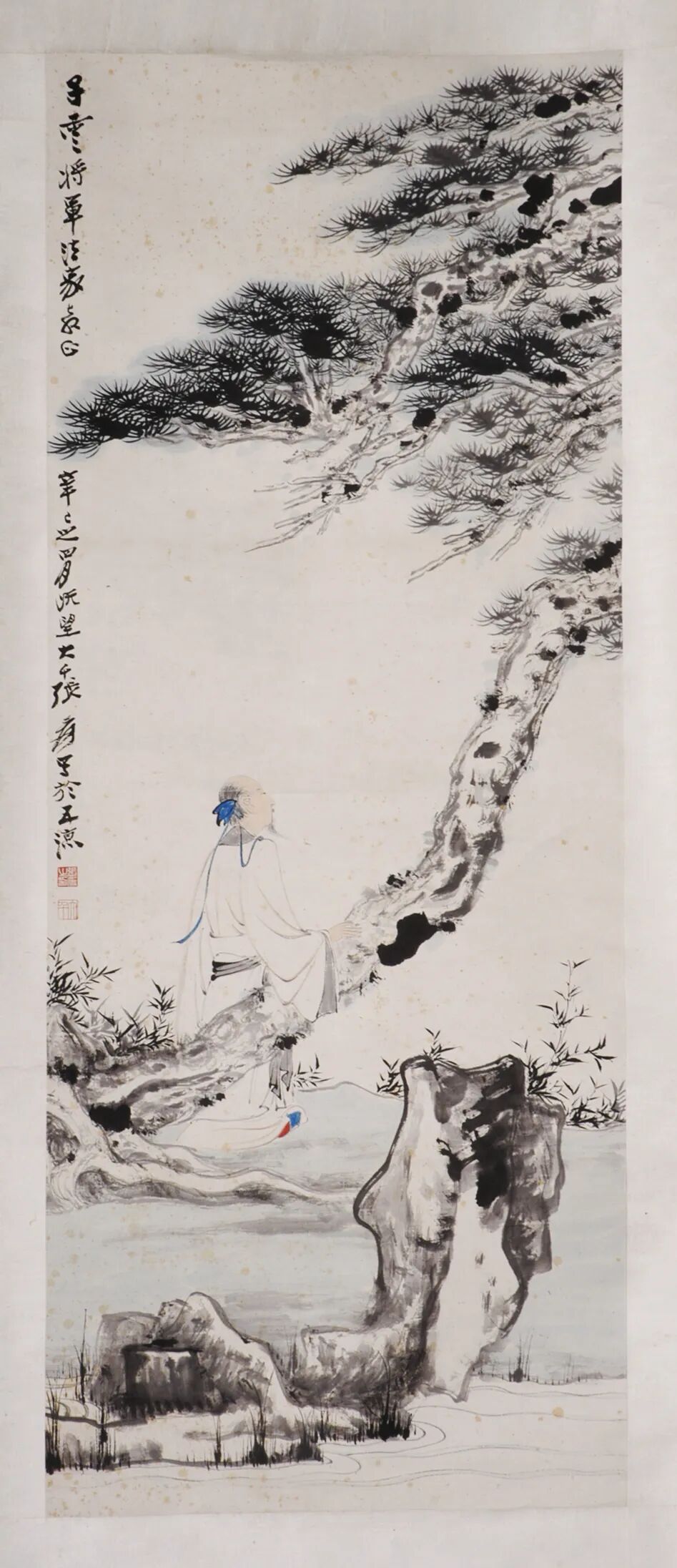 這幅作品在構(gòu)圖、筆墨、設(shè)色等方面都展現(xiàn)了極高造詣。畫面采用經(jīng)典的“S”形構(gòu)圖,古松自左下方向右上方蜿蜒伸展,形成強(qiáng)烈的動(dòng)勢與韻律感。松樹以“釘頭鼠尾”描法勾勒,筆觸蘊(yùn)含書法韻律:起筆如楷書之頓挫,行筆如草書之流暢,收筆若隸書之含蓄。這種源自陳洪綬而自出新意的筆法,既表現(xiàn)松樹的蒼勁質(zhì)感,又暗合中國書法力透紙背的審美要求。設(shè)色上通過淡墨層層渲染,營造“素以為絢”的審美境界。畫面以水墨為主調(diào),僅在高士衣襟處施以淡赭石,松針間點(diǎn)綴少許石綠。這種惜色如金的處理方式,既保持文人畫“淡而不厭”的審美特質(zhì),又通過微妙色彩對(duì)比增強(qiáng)藝術(shù)感染力。