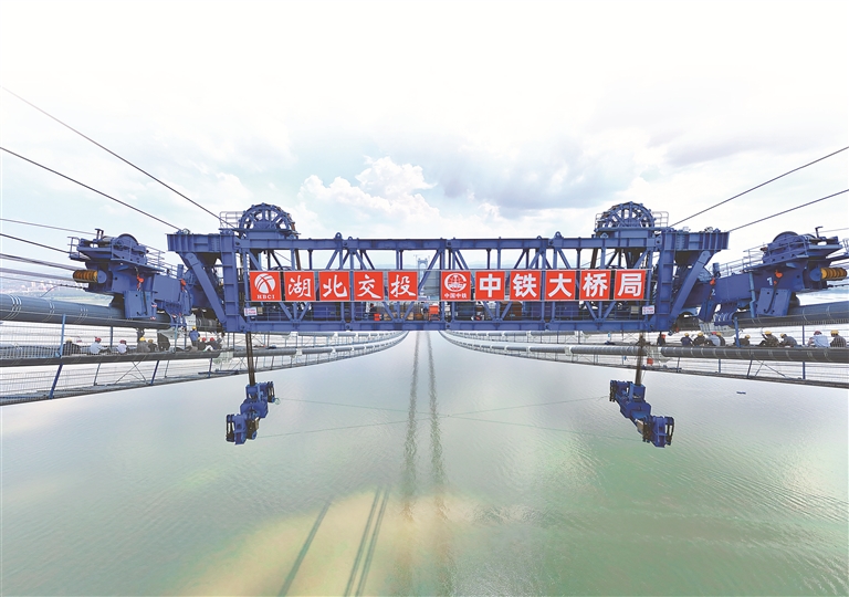 那就自己創(chuàng)造經(jīng)驗!湖北交投牽頭聯(lián)合承建單位,在大橋建設(shè)前期進(jìn)行了大量數(shù)據(jù)論證和可行性試驗,一次次研究優(yōu)化施工方案。他們堅持設(shè)備優(yōu)化與工藝創(chuàng)新“雙管齊下”,應(yīng)用纜載吊機(jī)、液壓提升裝置等裝備創(chuàng)新施工方法,順利攻克了難關(guān)。