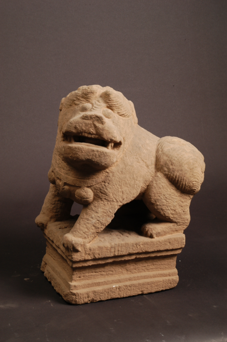 明代,征集。高35厘米,長26厘米,寬17.5厘米。石獅蹲于虛彌座上,頭昂首左視,頭頂刻劃成旋渦肉髻狀,尾部呈半球狀,上刻梅花形紋飾,頸下飾一毛纓及二鈴鐺,雕刻細膩。