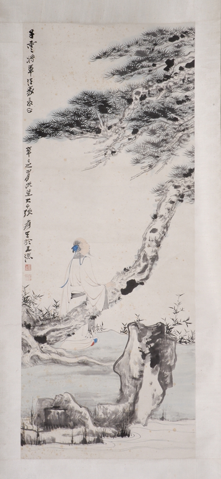 近現(xiàn)代,縱104.9厘米,橫41.6厘米,作者張大千。畫中高士倚坐山石,古松蒼勁,竹石清雅,筆墨兼工帶寫,意境空靈,盡顯文人超然之態(tài)。