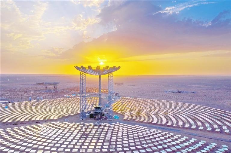 一排排風電機組整齊列陣迎風旋轉,蔚然壯觀;成片的光伏板將茫茫戈壁裝點成浩瀚的藍色海洋,熠熠生輝;上萬塊定日鏡和吸熱塔構成超級鏡子發(fā)電站,耀眼且震撼。
