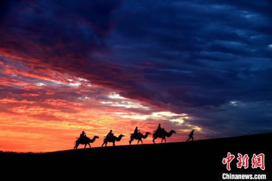 雨后的甘肅省敦煌市鳴沙山月牙泉景區(qū),朝霞滿天,景色迷人。(資料圖) 張曉亮 攝
