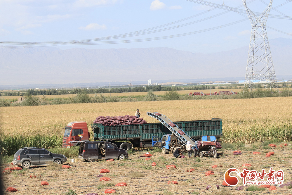 腳下有稻田,耳邊有水聲。帶著泥土的洋蔥整跺碼放,依次裝進卡車?yán)?,鮮綠的高原夏菜在田間地頭收割后送進發(fā)往南方的冷柜,百畝靑儲玉米經(jīng)過壓縮打包等待進入牧場糧倉……祁連山下秋收正在火熱進行中。