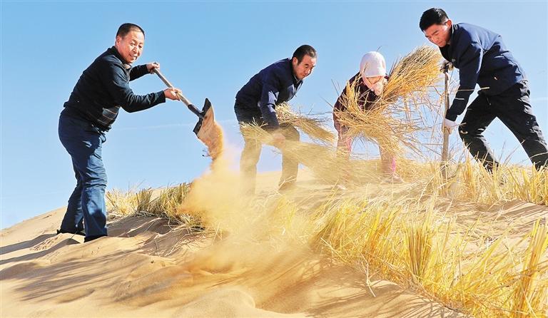 古浪縣八步沙林場(chǎng)工人在騰格里沙漠邊緣打草方格壓沙。甘肅省大力弘揚(yáng)“時(shí)代楷模”八步沙林場(chǎng)“六老漢”的奮斗精神,2012年至2021年,全省累計(jì)完成植樹造林4321.21萬(wàn)畝,沙化土地綜合治理2015萬(wàn)畝。張文燦攝(中經(jīng)視覺(jué))