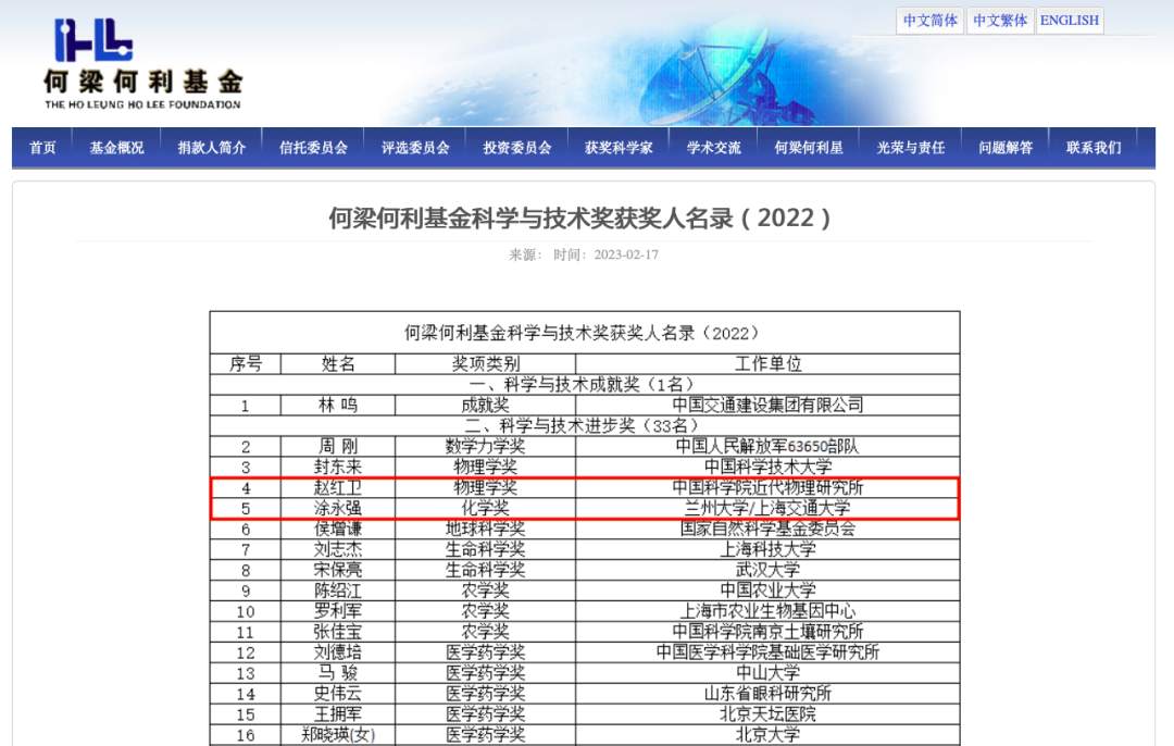 日前,何梁何利基金2021和2022年度頒獎大會在北京舉行,共授予112名杰出科技工作者。其中,中國科學院近代物理研究所趙紅衛(wèi)、蘭州大學涂永強榮獲2022年度何梁何利基金科學與技術進步獎。