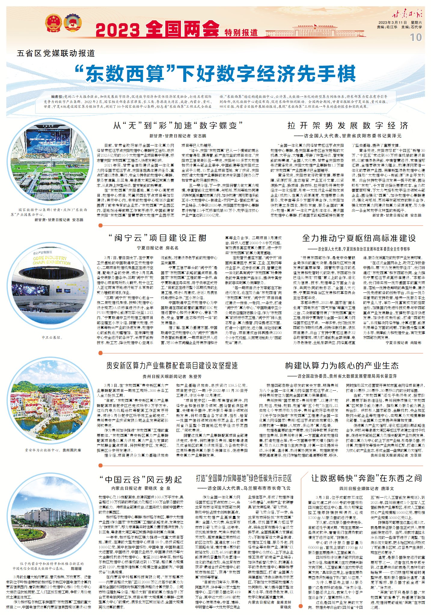 編者按:黨的二十大報(bào)告提出,加快發(fā)展數(shù)字經(jīng)濟(jì),促進(jìn)數(shù)字經(jīng)濟(jì)和實(shí)體經(jīng)濟(jì)深度融合,打造具有國際競爭力的數(shù)字產(chǎn)業(yè)集群。2022年2月,國家相關(guān)部委在京津冀、長三角、粵港澳大灣區(qū)、成渝、內(nèi)蒙古、貴州、甘肅、寧夏8地建設(shè)國家算力樞紐節(jié)點(diǎn),規(guī)劃了10個(gè)國家數(shù)據(jù)中心集群,標(biāo)志著“東數(shù)西算”工程正式全面啟動。“東數(shù)西算”通過構(gòu)建數(shù)據(jù)中心、云計(jì)算、大數(shù)據(jù)一體化的新型算力網(wǎng)絡(luò)體系,將東部算力需求有序引導(dǎo)到西部,優(yōu)化數(shù)據(jù)中心建設(shè)布局、促進(jìn)東西部協(xié)同聯(lián)動。全國兩會期間,甘肅日報(bào)聯(lián)合寧夏日報(bào)、貴州日報(bào)、四川日報(bào)、內(nèi)蒙古日報(bào)開展聯(lián)動報(bào)道,展現(xiàn)“東數(shù)西算”工程實(shí)施一年來的最新探索和實(shí)踐成果。